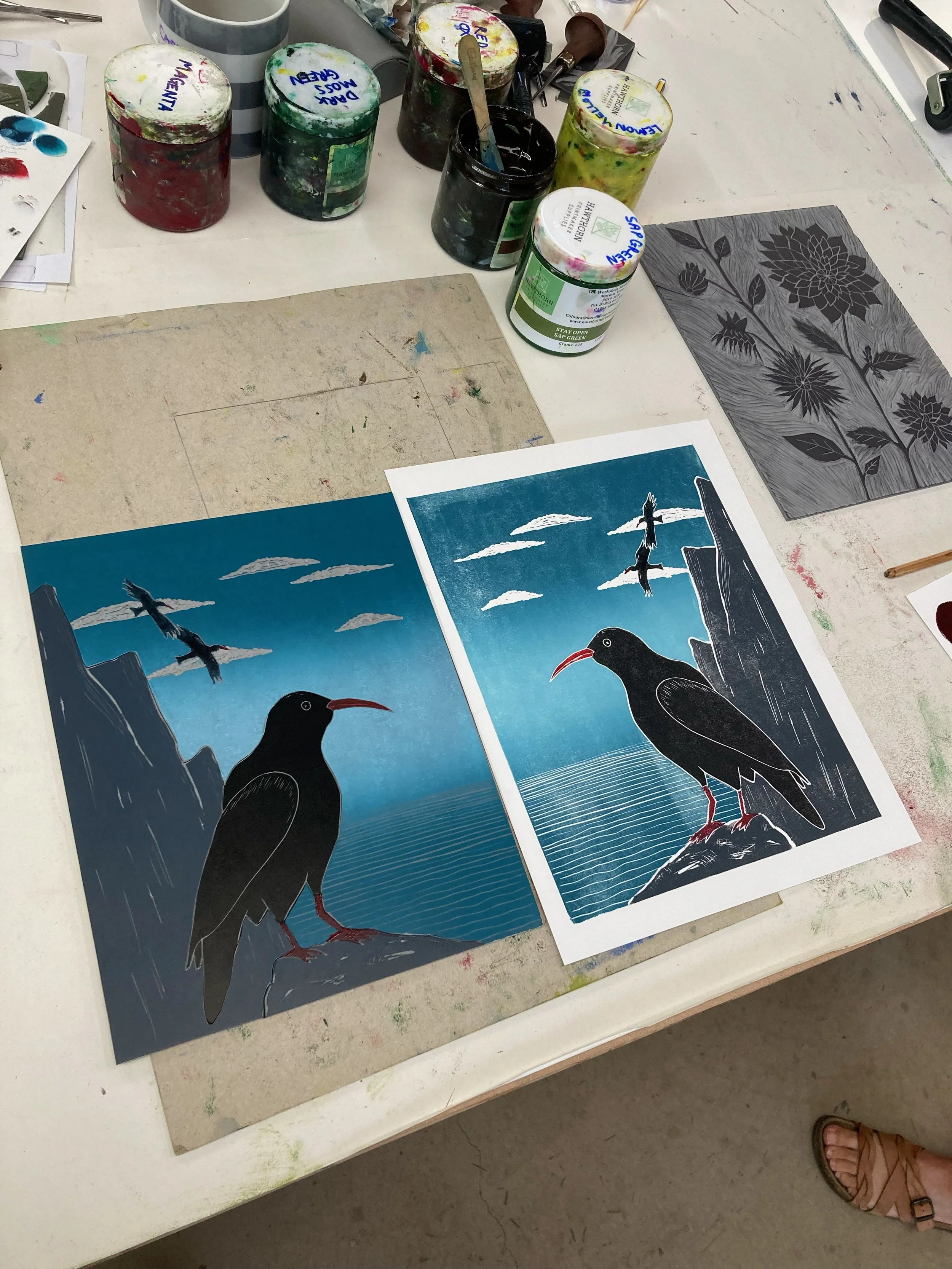 Bronte teaches short courses, on which students will learn the basic and technical skills to create a multi coloured Lino print using the jigsaw method of separating colours within a single block. Students will be guided through design, cutting, block separation, mixing coloured inks and hand printing to execute their own unique print. The course is aimed at giving students freedom of creativity, whilst understanding the limitations in order to achieve their desired final art prints.